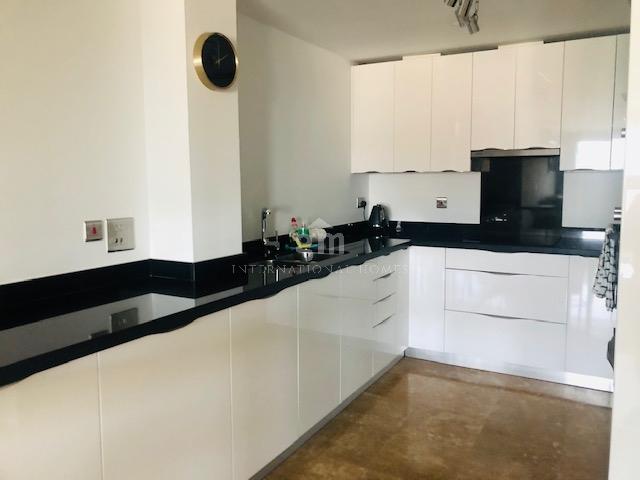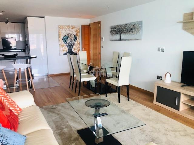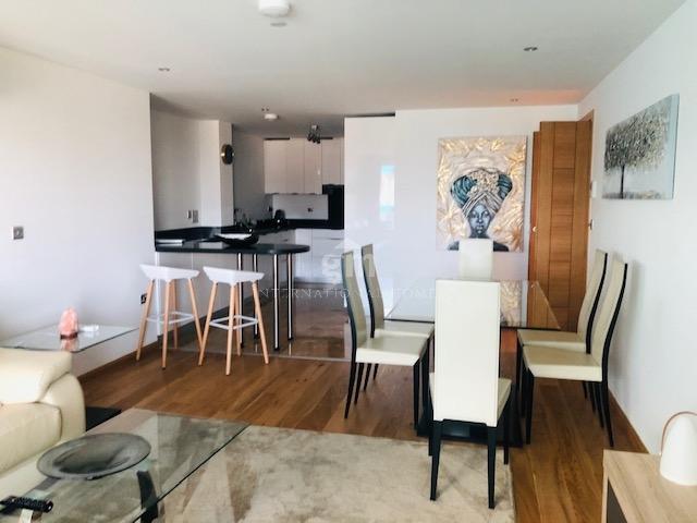 The master bedroom features fitted wardrobes and an en-suite shower room, while the second bedroom is equally well-proportioned. The apartment boasts a fully fitted modern kitchen with Bosch appliances, seamlessly leading into a spacious open-plan lounge and dining area.