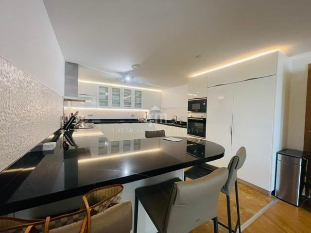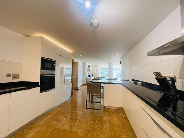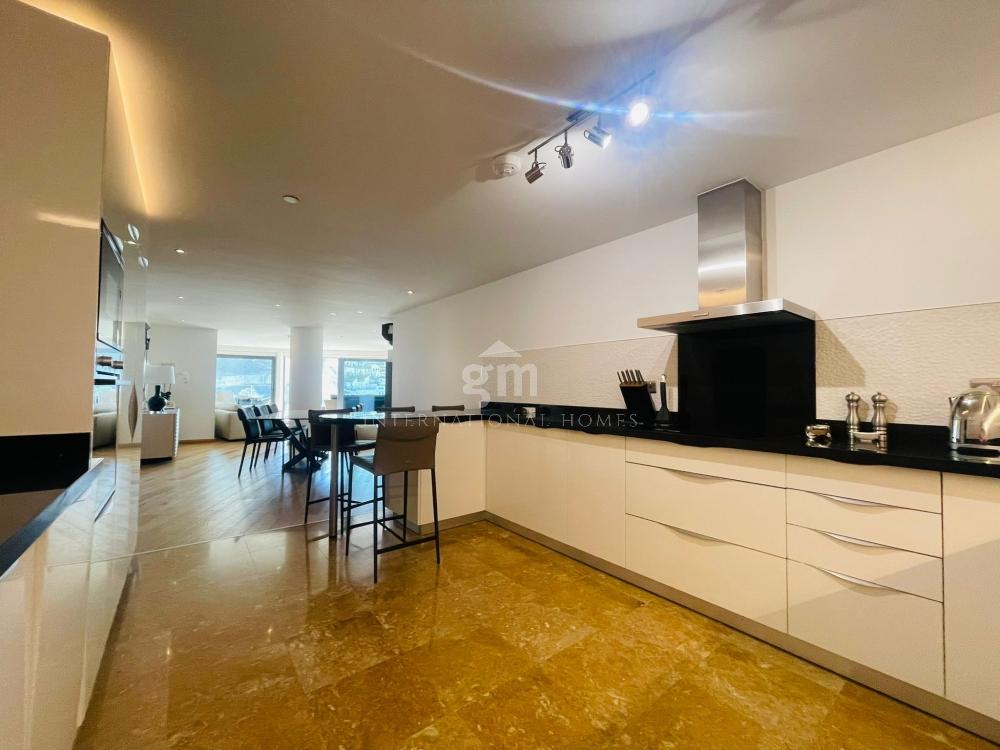 - Kitchen & Living Area: Enjoy an open-plan kitchen adorned with top-of-the-range Bosch appliances, elegant white lacquered cabinetry, and stylish black granite countertops. The kitchen includes a breakfast bar, perfect for casual dining. The spacious lounge features large double doors that flow into the dining area, both beautifully decorated to high standards.