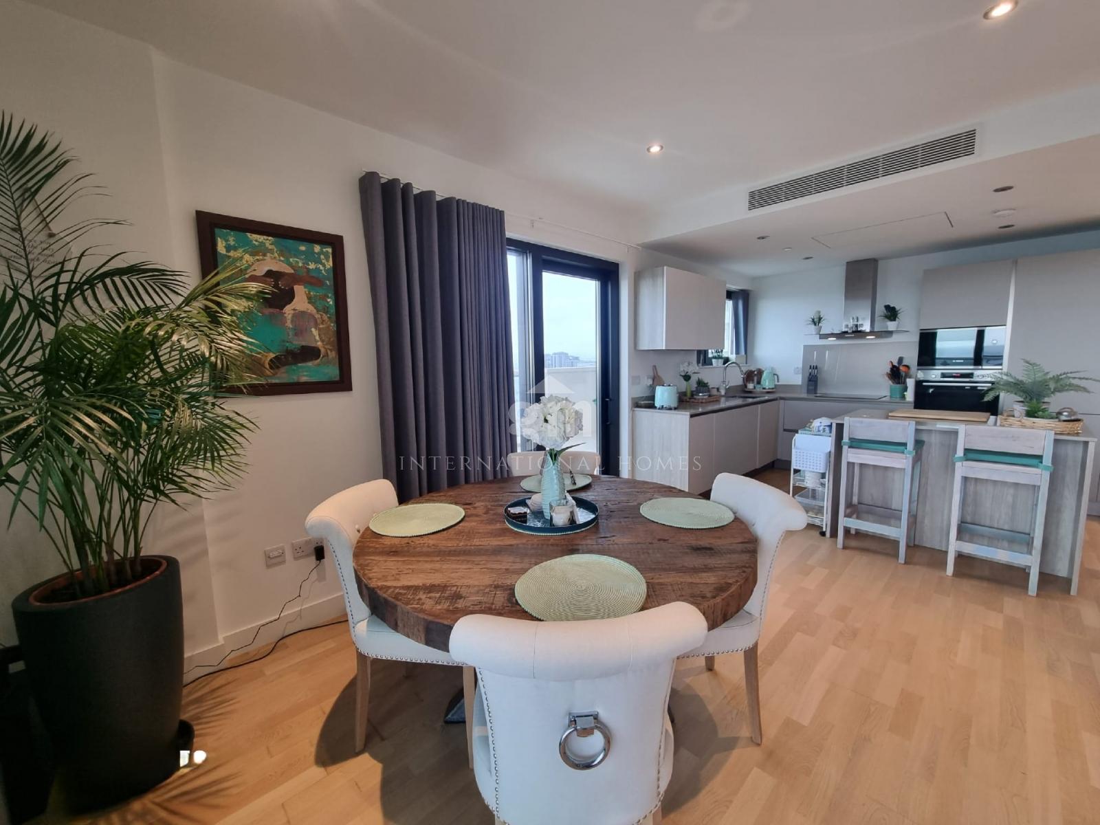 The open-plan living area boasts a modern kitchen fully fitted with Bosch and Smeg appliances, flowing seamlessly into a generously sized lounge and onto a large private terrace with spectacular views.