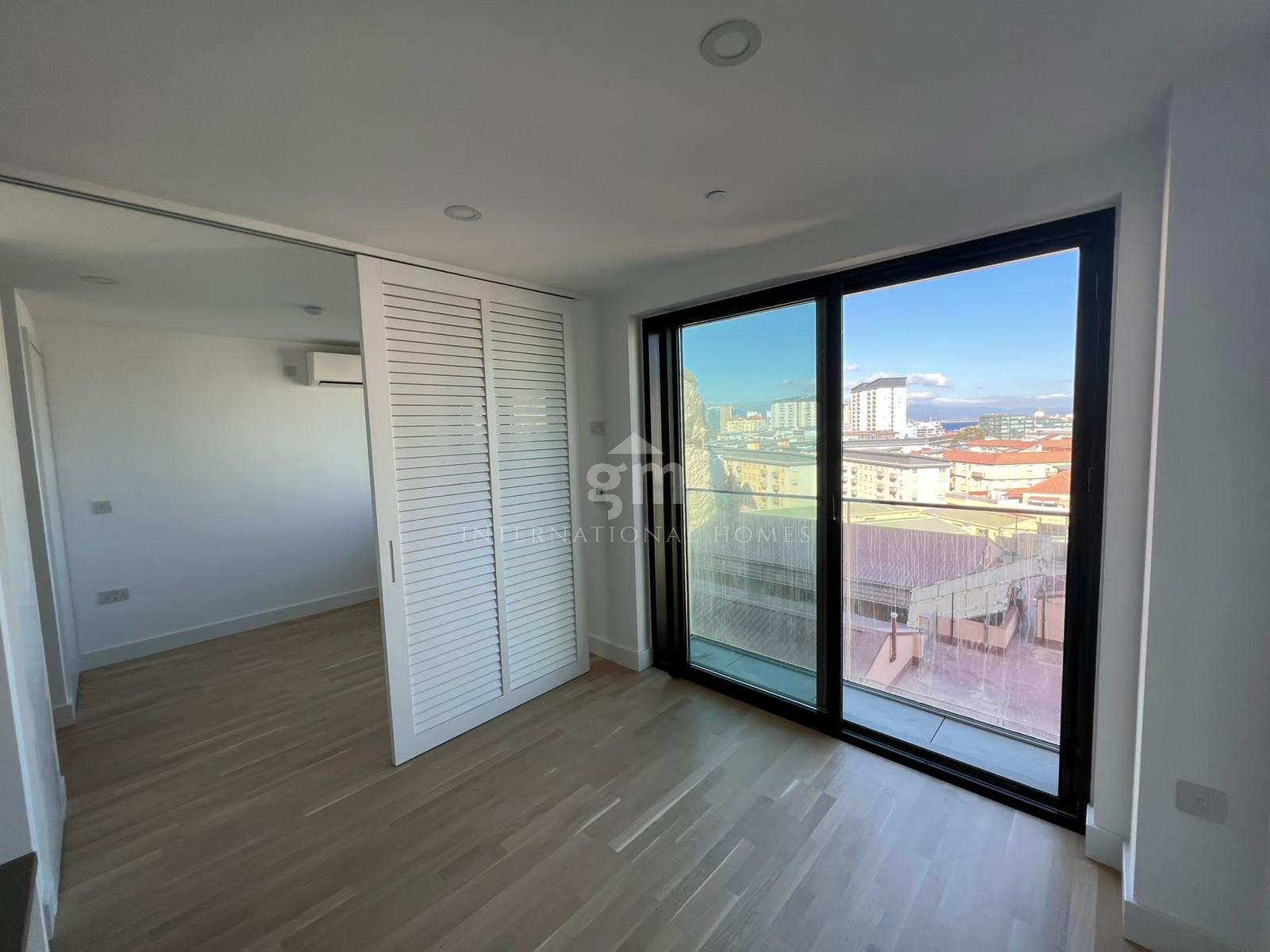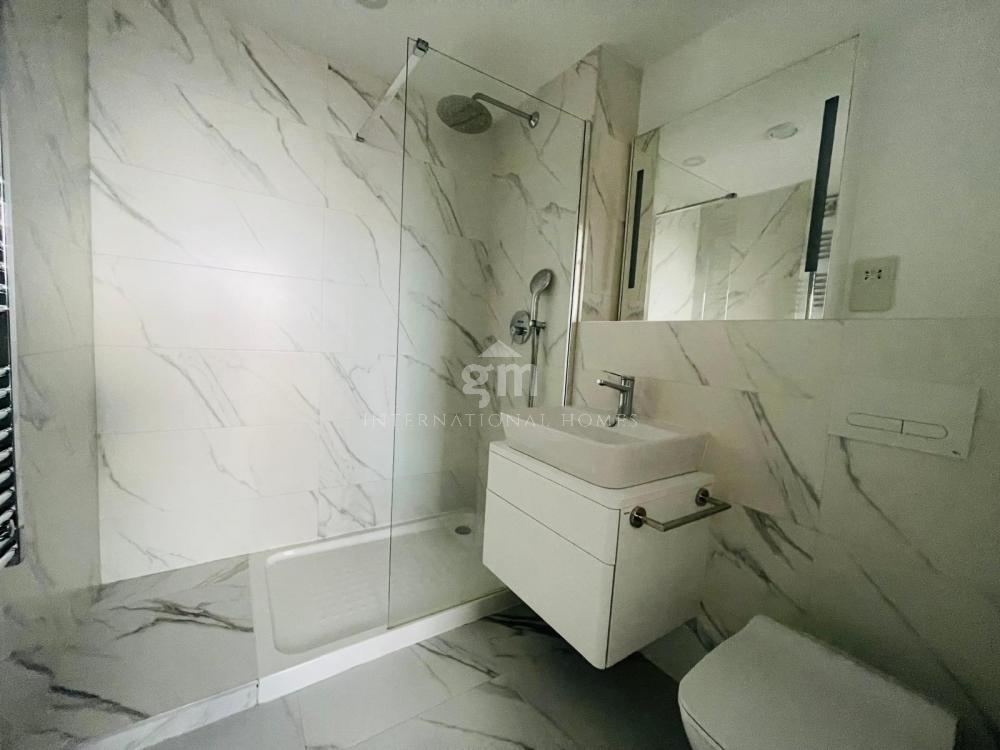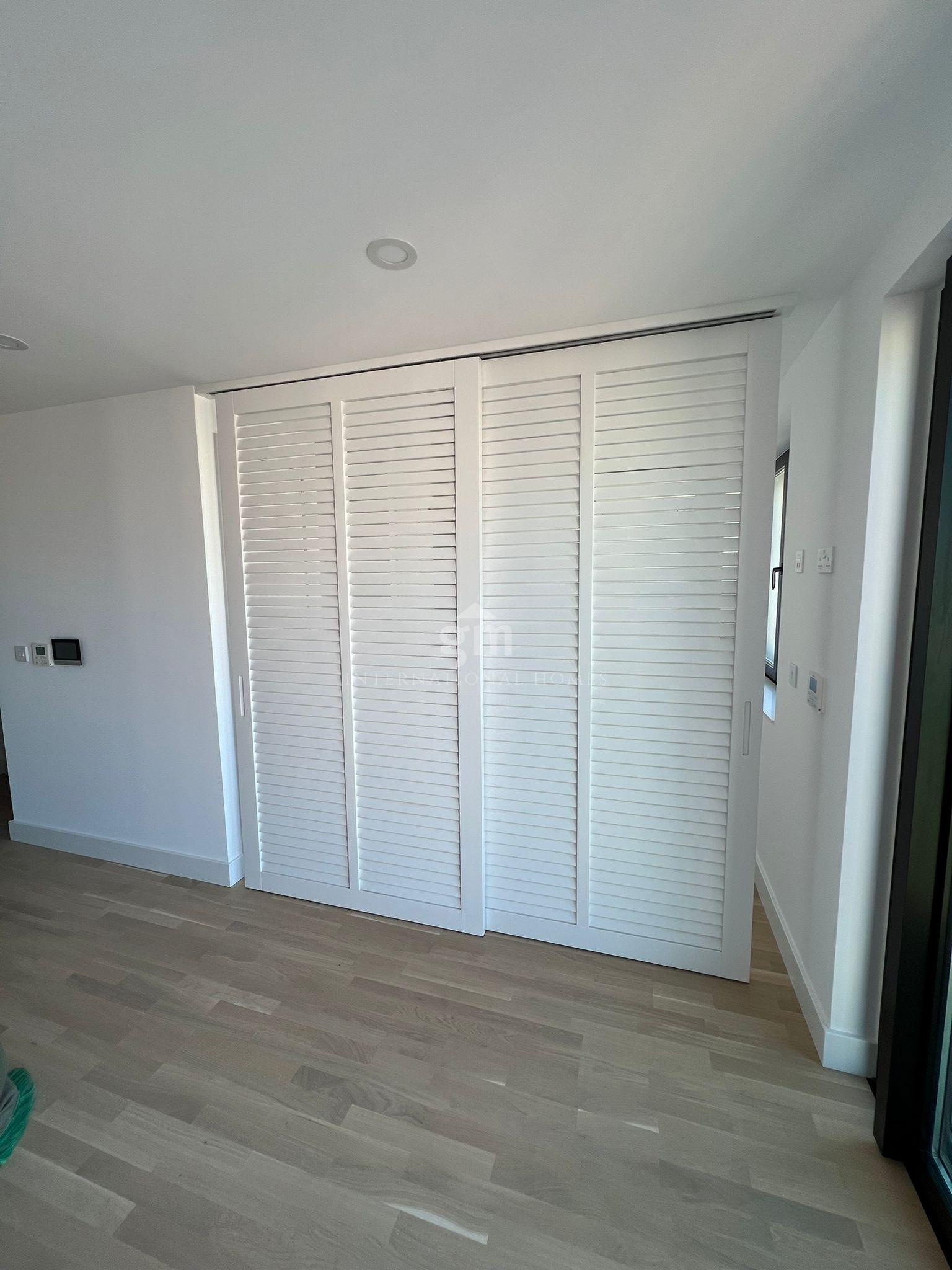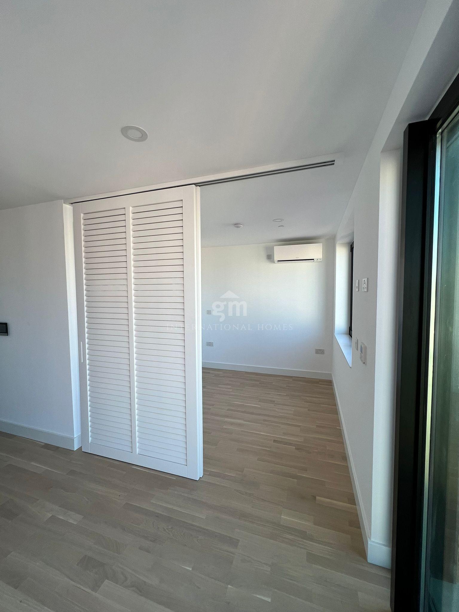 This contemporary residence features a separate sleeping area, elegantly divided by sliding doors, leading to a luxurious walk-in shower room. Ample built-in storage ensures practicality meets style.